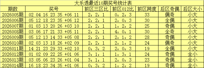 大乐透第2026014期奖号开出:16 18 23 34 35 +01 06。其中前区三区比为0:3:2,012路比为1:2:2,后区开出全小、一奇一偶奖号。