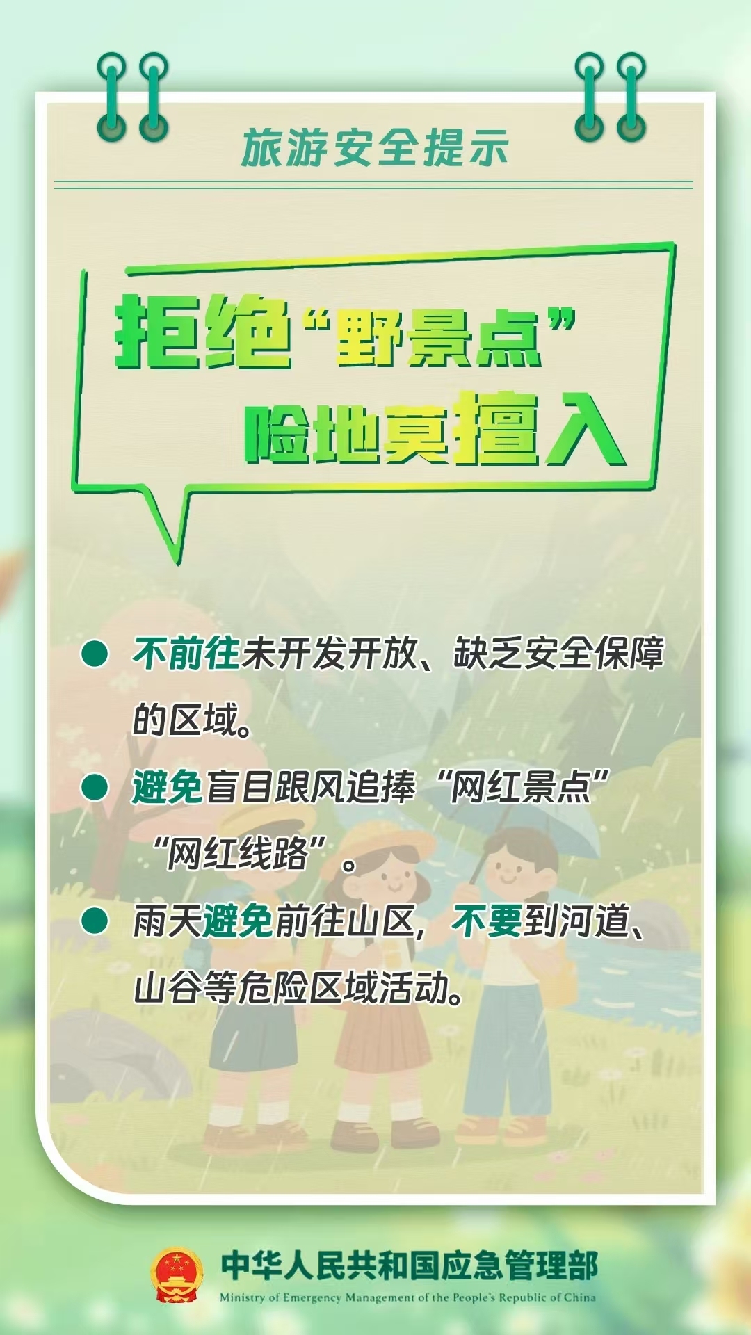 不要盲目挑战高难度路线;不要在大风、强暴雨等极端天气出行。